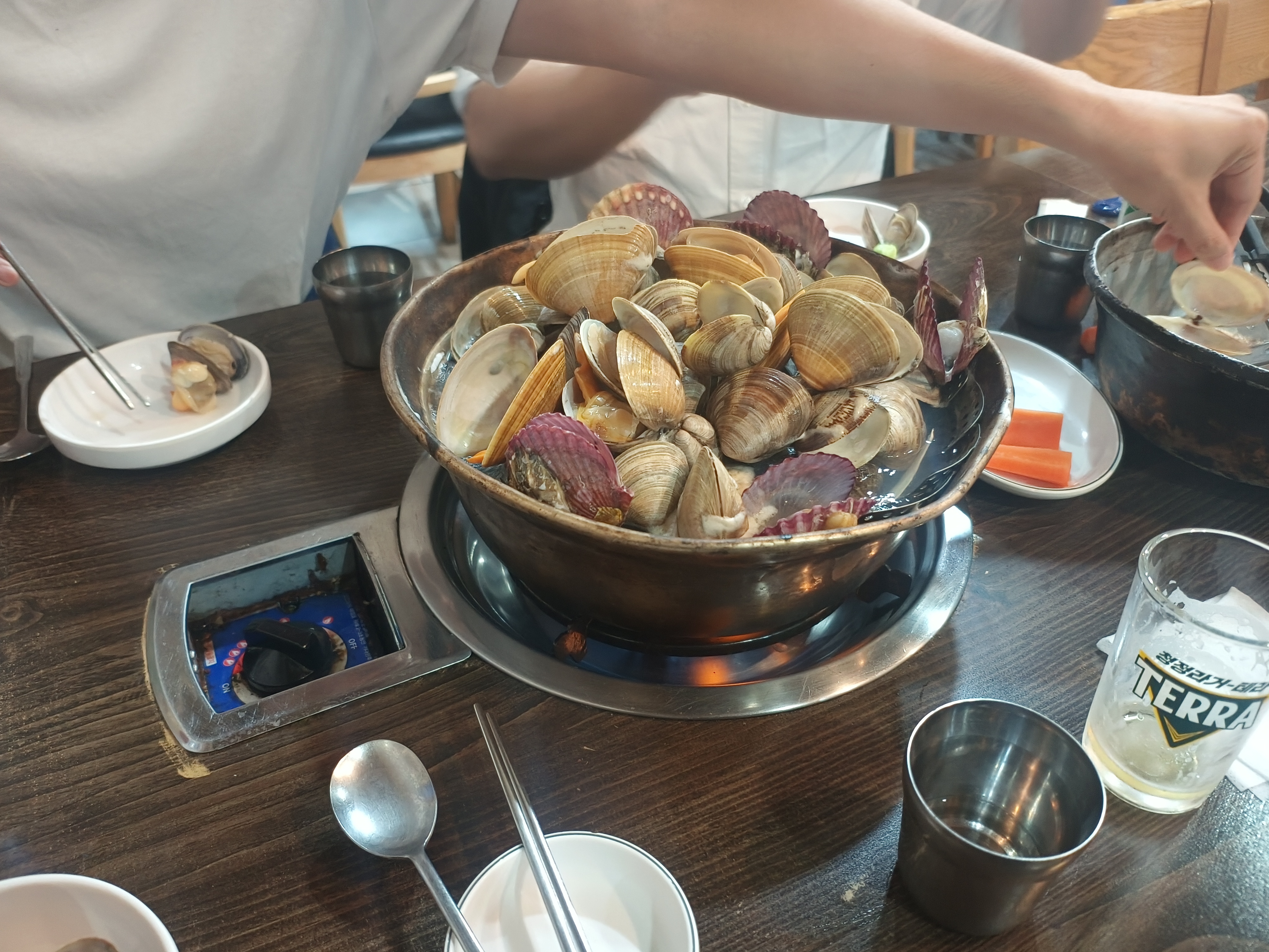 젊고(A), 덜 젊고(B), 아저씨(C)가 된 세 사람이 오랜만에 모였다. 시간은 저녁, 메뉴는 조개탕! 나는 요즘 사람들을 만나면 웬만하면 해산물을 원하는데 그 이유는 앞으로 바다 환경이 황폐해 질 것을 단정하기에 그렇다. 그렇게 생각하고 나니 내 마음은 해산물로 가게만 된다.. 이번에는 내가 먼저 메뉴를 말하지 않았는데 차려진 훌륭한 바다 메뉴였다. 기분 좋은 저녁의 시작이었다.